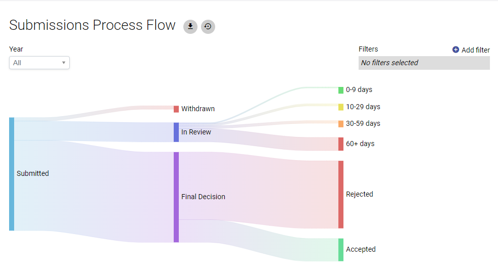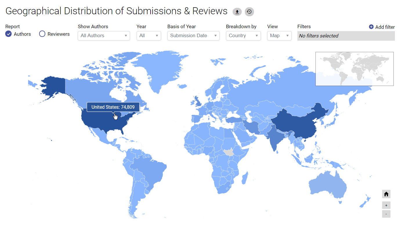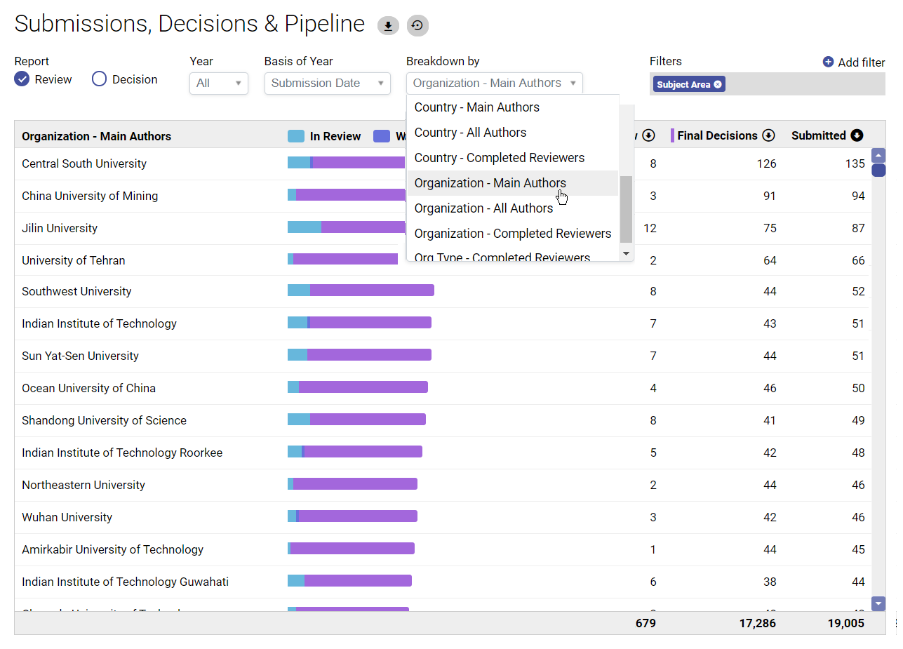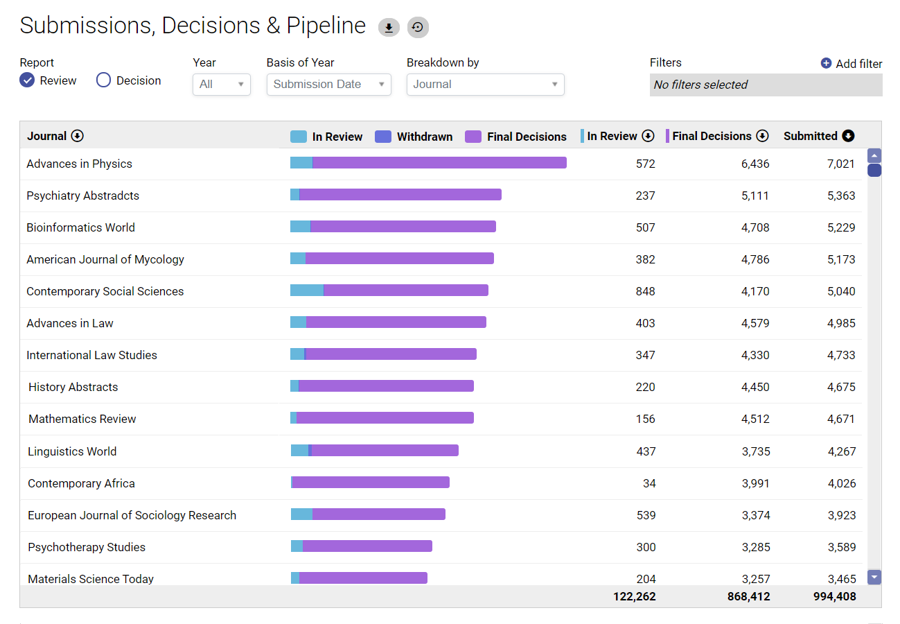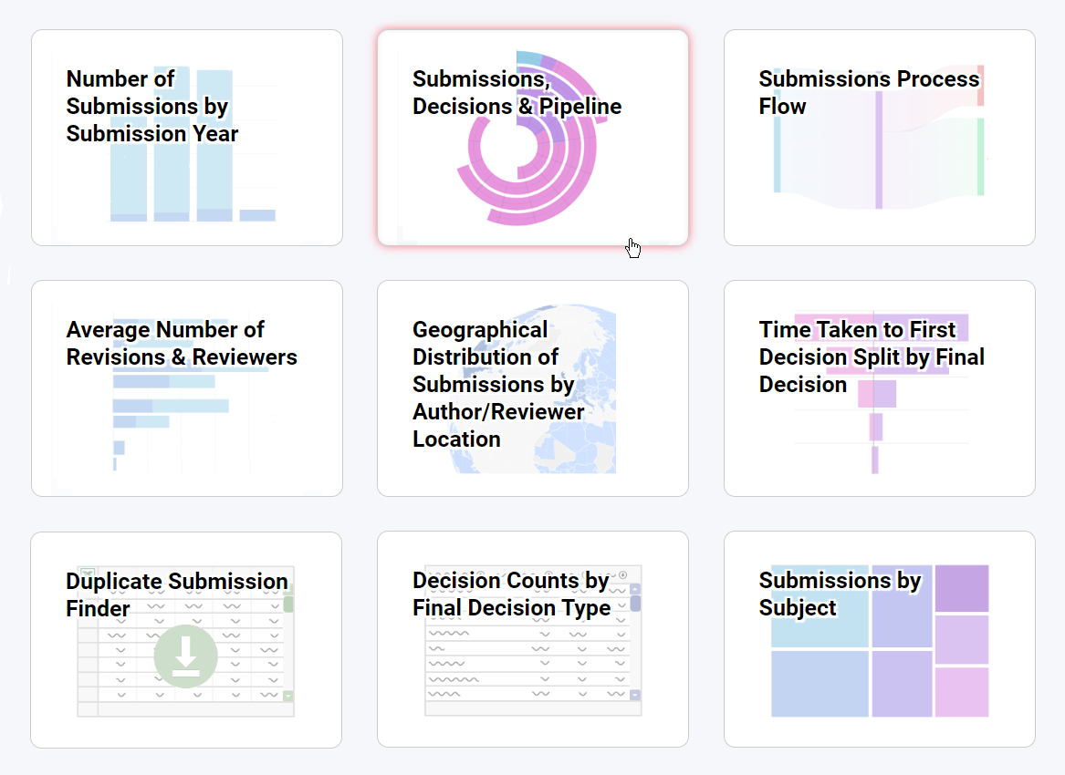 - Not just submissions: see the complete picture, including authors, reviewers, funders, organizations, article workflow & more