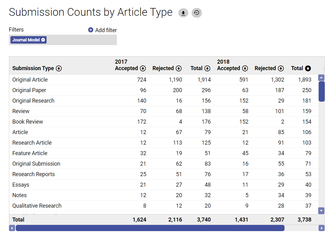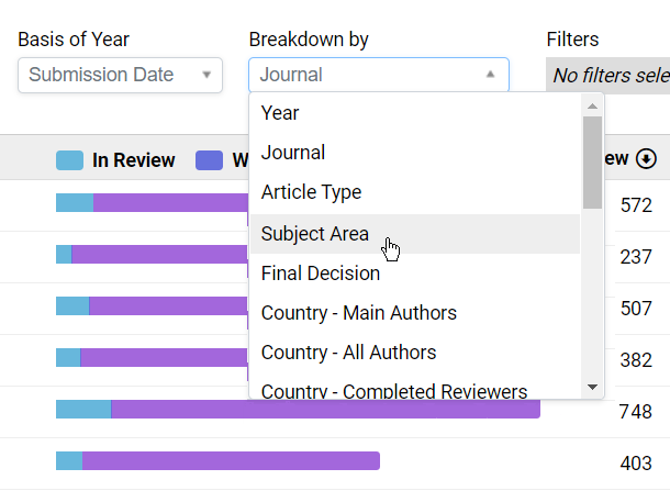 Easily filter by journal, subject, article type, country, region, decision & more